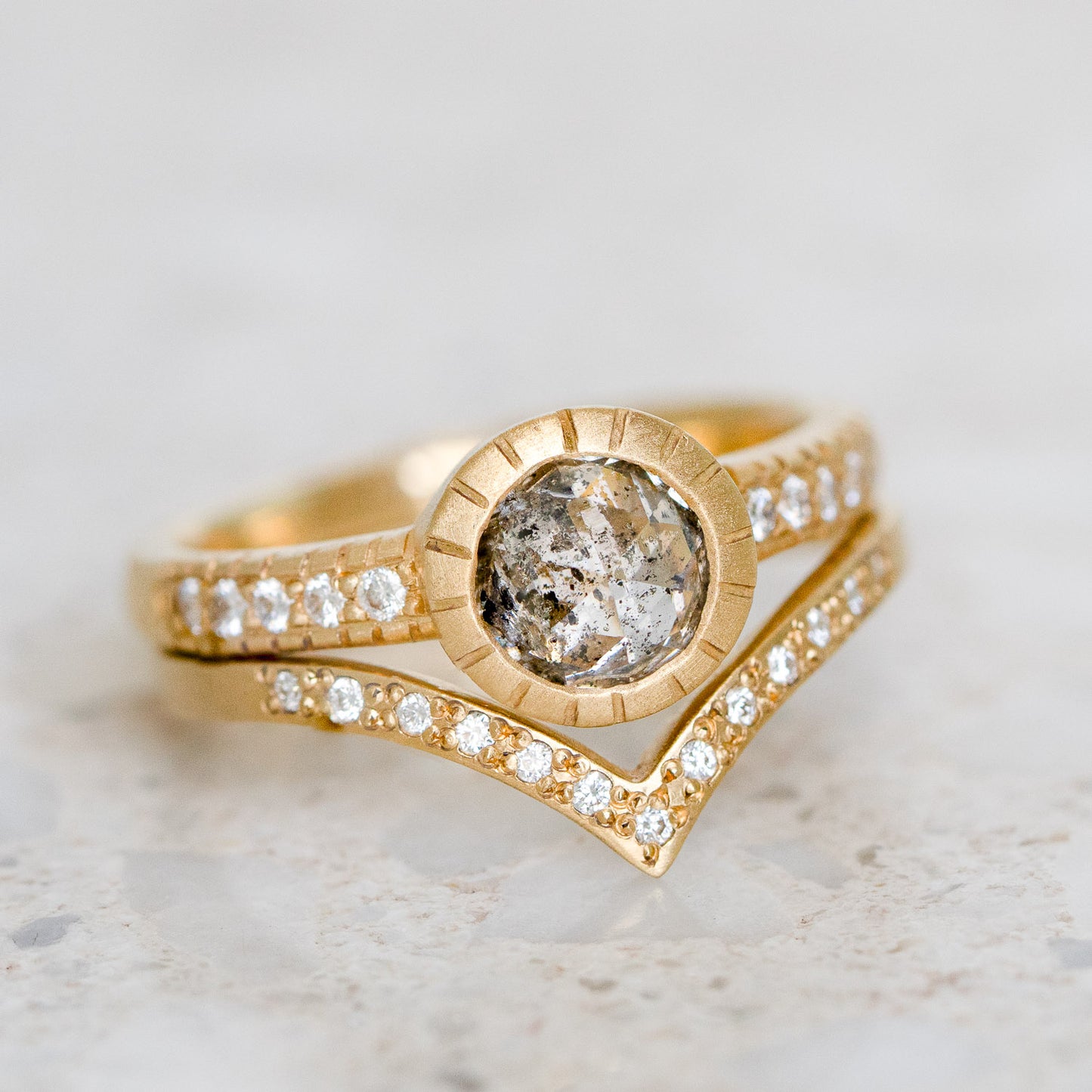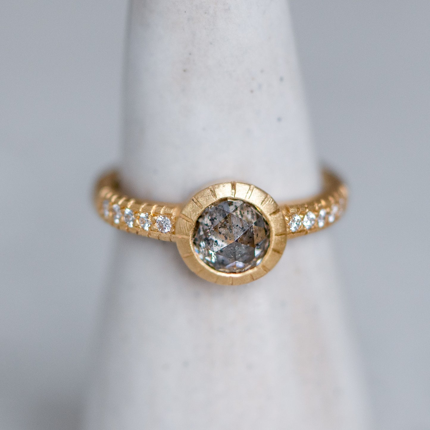 A rose cut salt and pepper diamond is set in our Belle Ring with G/VS white brilliant cut diamonds in the band.
