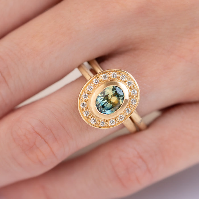 A parti green sapphire has been set into our Pompeii Ring with a surround of G/VS brilliant cut white diamonds.