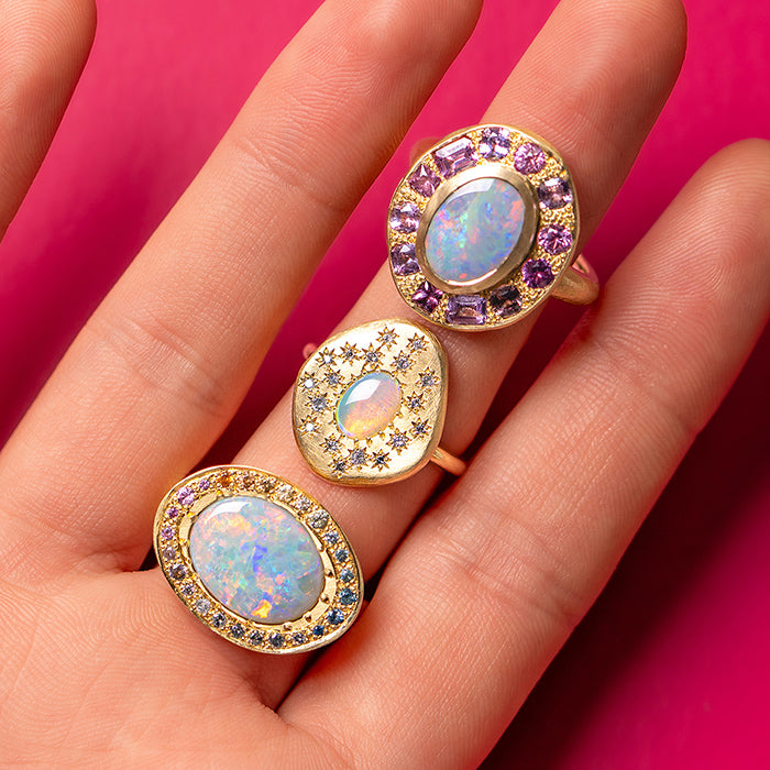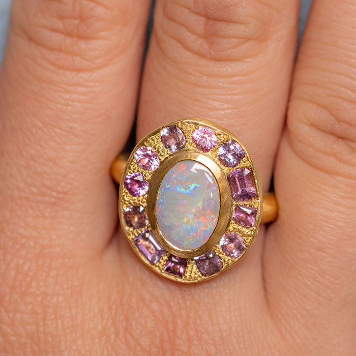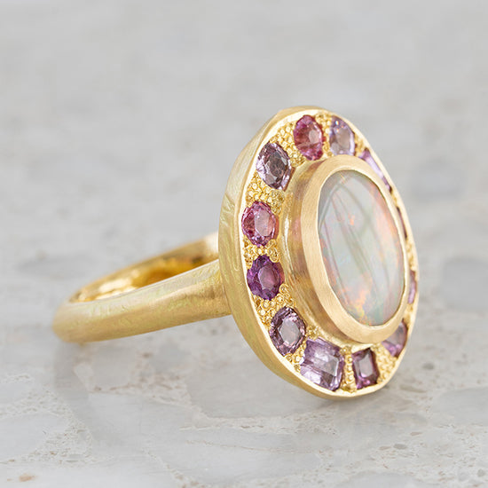 This one of a kind Pebble Ring has been set with a black opal from Lightning Ridge, surrounded by shades of pink and purple sapphires.